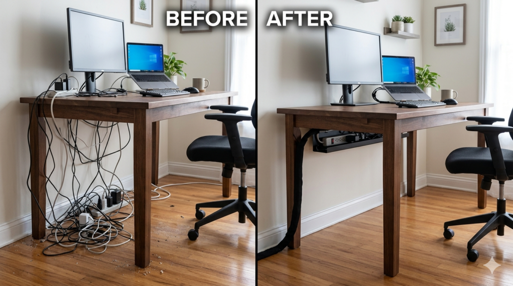 Psychological studies consistently show that visual clutter translates directly into cognitive overload. When you sit down at your desk and see a tangled web of black cords dangling by your feet, it subtly drains your focus before the workday even begins. Beyond aesthetics, uncontrolled wires are dust traps and genuine safety risks that can damage expensive equipment if accidentally caught by a foot.