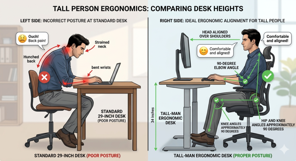 Being exceptionally tall has its advantages, but seamlessly fitting into a standard corporate workspace is rarely one of them. The vast majority of office furniture is manufactured to accommodate the statistical average, which typically tops out around 5’10”. If you are 6’2″ or taller, sitting at a standard workstation often feels like trying to fold yourself into a child’s desk.