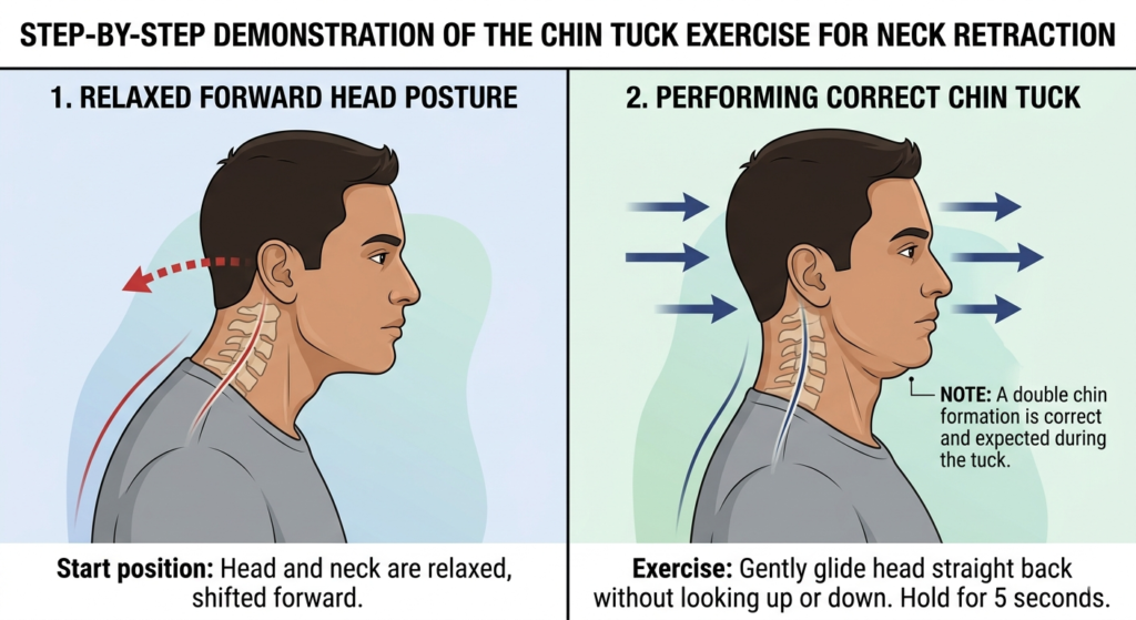 The most critical movement for correcting a forward head is neck retraction. This is not about looking up at the ceiling; it is about gliding the skull straight back horizontally to align it over the torso.