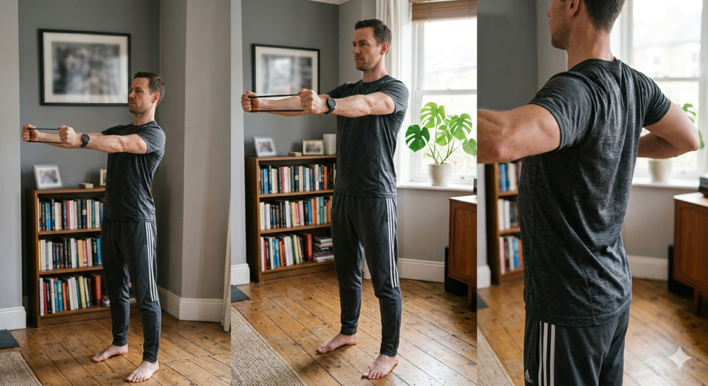 - Stand up straight and hold a light elastic tool in front of you with both hands at chest height. Utilizing resistance bands provides excellent, progressive tension for this movement.