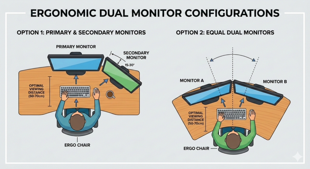 Why it works: Your neck remains neutral for the majority of the day. You only glance at the secondary screen with your eyes or a slight head turn, rather than holding a twisted posture for hours.