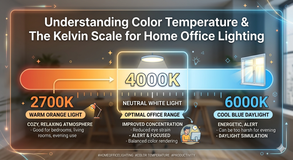 The best color temperature for an active workspace is between 4000K and 5000K. This range mimics natural daylight, which helps suppress melatonin production and keeps the brain alert and focused during the day.