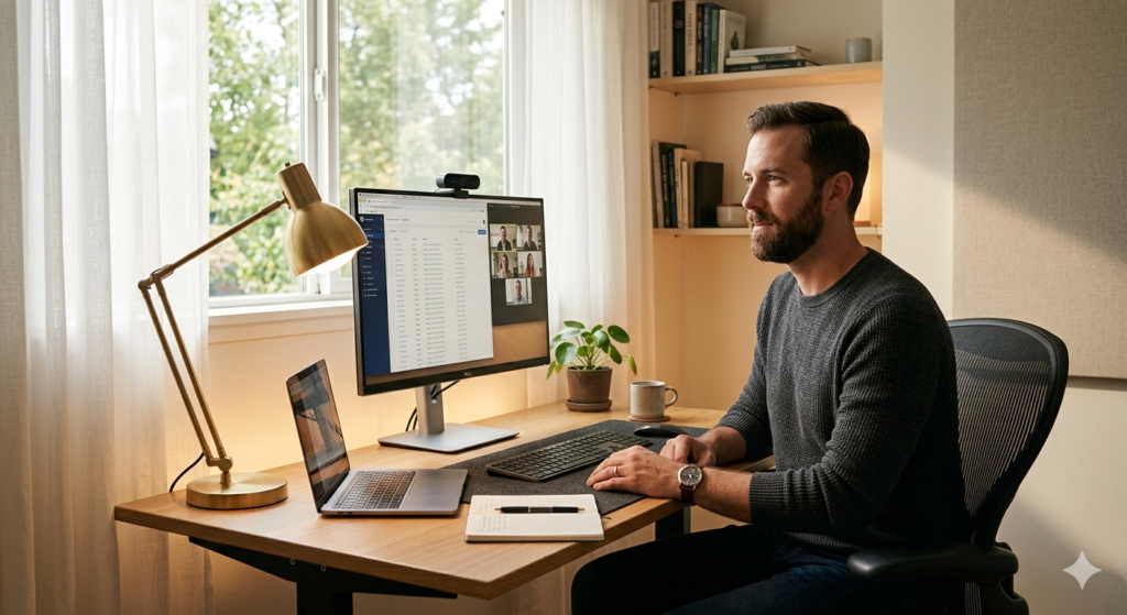 - The Optimal Position: Place your desk perpendicular to windows. This allows the natural light to wash across your workspace horizontally, illuminating your face for video calls without striking your monitor glass. If the sun is too harsh, diffuse it using sheer curtains or blinds.