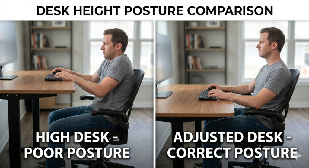 If your keyboard is higher than your elbows, your wrists must flex backward (extension), and your shoulders must lift to compensate. This is the mechanical root of most upper body office pain.