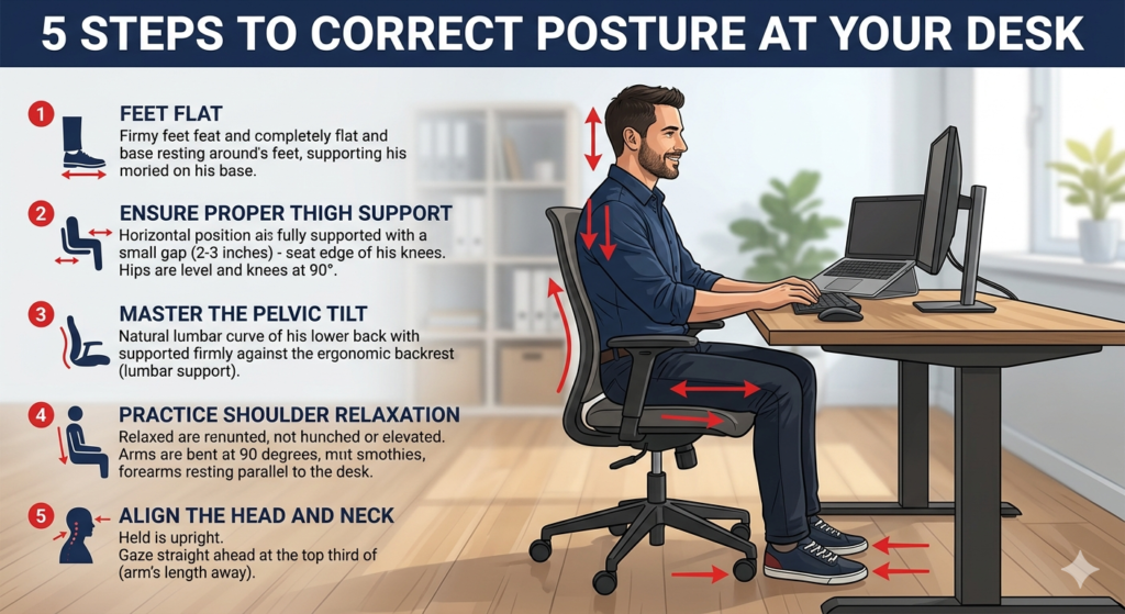 Good ergonomics is not about sitting rigidly like a statue; it is about establishing a mechanically sound baseline that your body can easily return to. By following this step-by-step checklist every morning, you take the guesswork out of your physical alignment. Remembering exactly how to sit correctly—from keeping your feet flat to mastering pelvic tilt—is the single most effective way to eliminate afternoon fatigue and protect your musculoskeletal health for years to come.