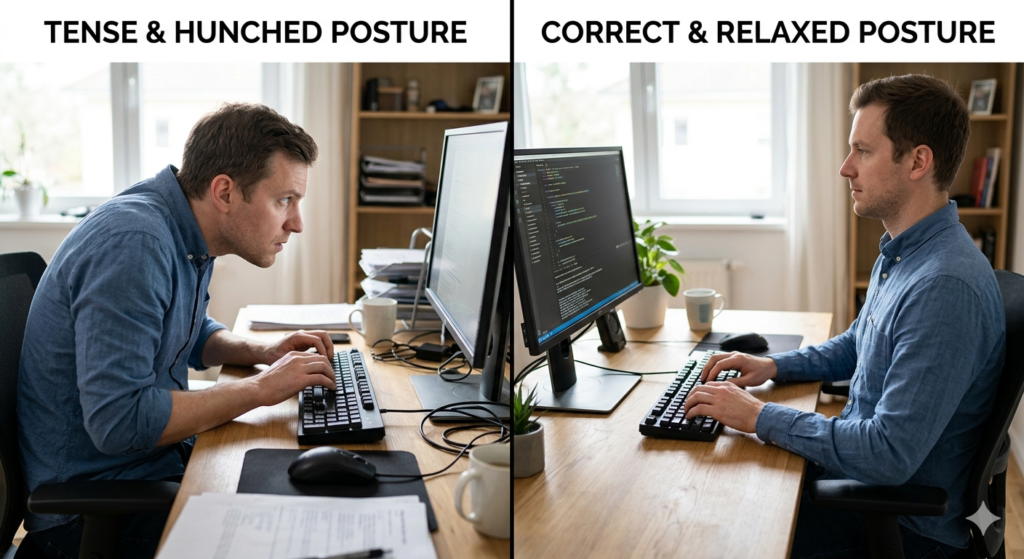 - Drop Your Shoulders: Consciously pull your shoulders down and away from your ears. Shoulder relaxation is critical for preventing tension headaches and neck stiffness.