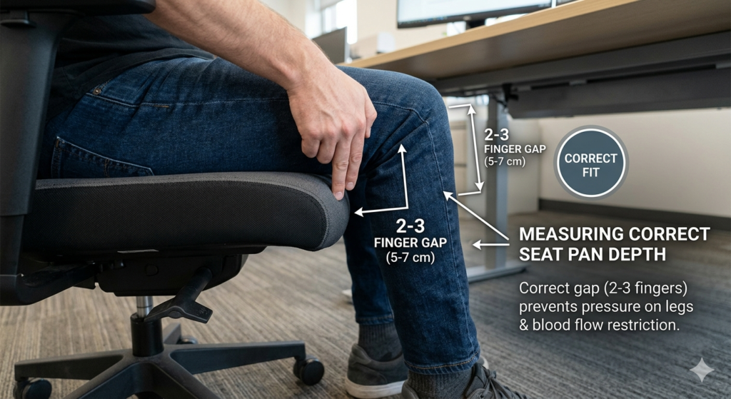 If the seat pan is too long for your body, the hard front edge of the chair will dig directly into the popliteal fold (the soft area behind your knees). This area houses major blood vessels and nerves that run down into your calves.