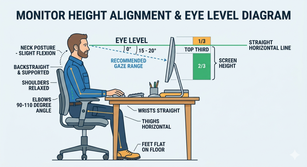 If you place your monitor too high—where the center of the screen is directly at your eye level—you will be forced to look upward. Looking upward for prolonged periods causes neck extension (tilting the head backward), which pinches the suboccipital nerves at the base of the skull and rapidly induces fatigue.