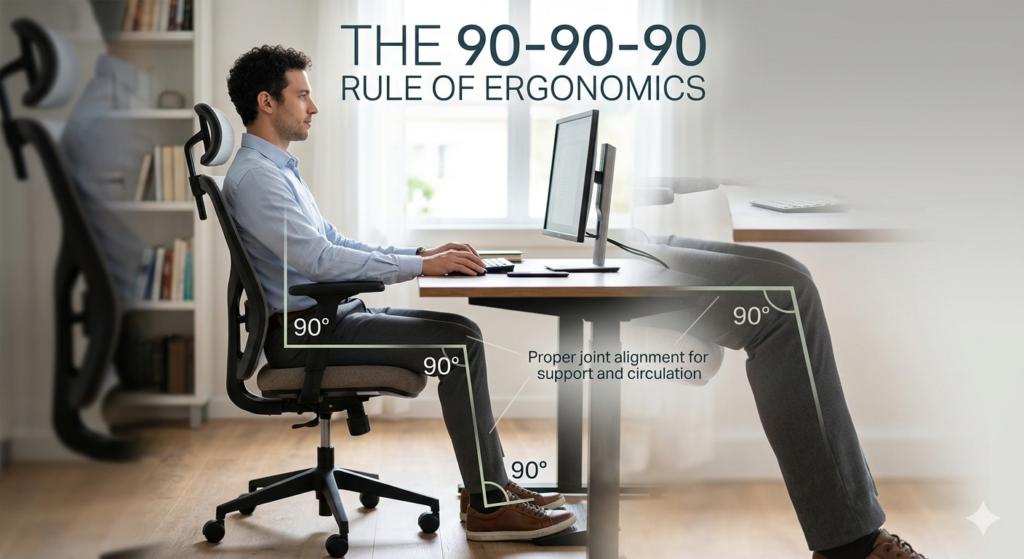 The 90-90-90 rule is an ergonomic guideline suggesting that when seated, your hips, knees, and ankles should all be positioned at roughly 90-degree angles. This ensures the body is mechanically supported and balanced.
