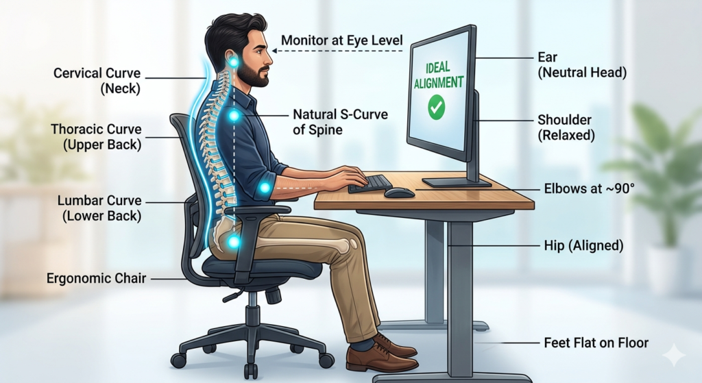 The lower back (lumbar region) curves inward, the mid-back (thoracic region) curves outward, and the neck (cervical region) curves inward again. A neutral posture respects and supports these curves. Your chair’s lumbar support should fill the gap in your lower back, preventing your pelvis from rolling backward into a slouch.