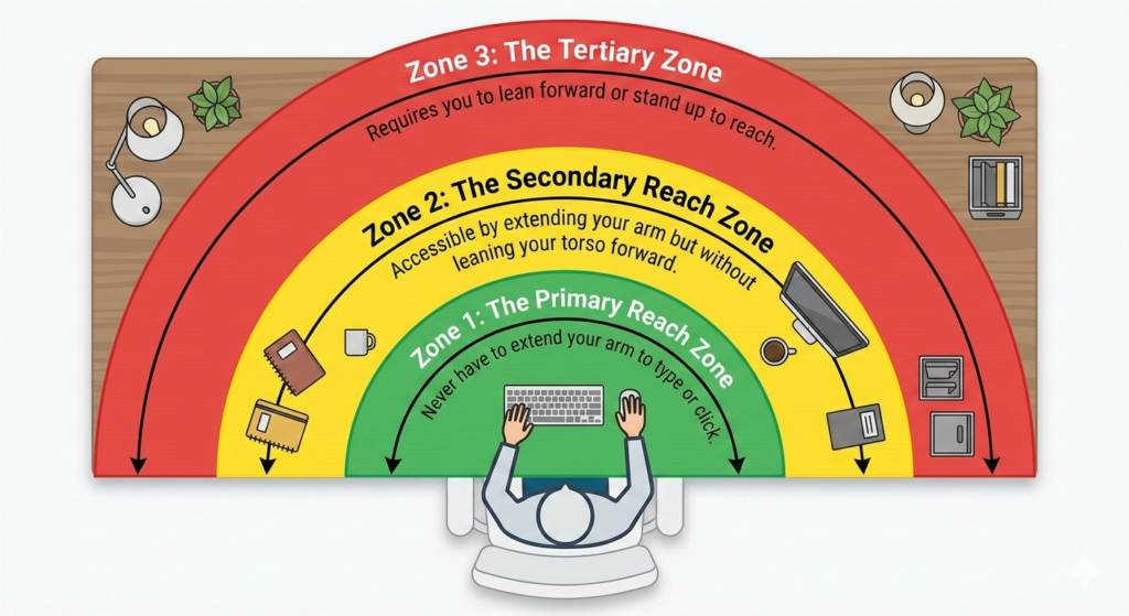 - Rule: Never place your mouse or phone in this zone, as repeated leaning creates torque on the lower spine.