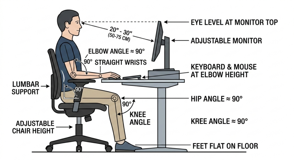 When your setup ignores your specific body metrics, you compensate by shrugging shoulders (if the desk is too high) or leaning forward (if the monitor is too far), leading to repetitive strain injuries.