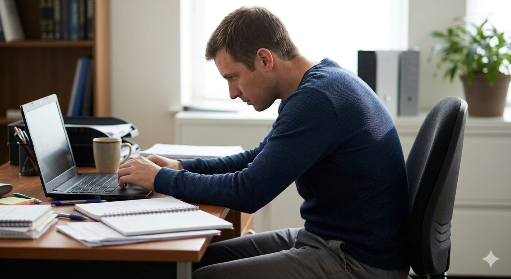 The physical layout of a standard workstation practically mandates poor posture. Unless you actively manage your environment, your body will follow the path of least resistance, which is usually a forward collapse.